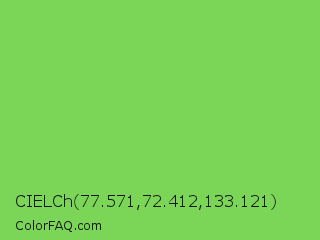 CIELCh 77.571,72.412,133.121 Color is a normal green color and the nearest color is Mantis #74c365. Hex code #7bd557 and RGB value is rgb(123,213,87). In RGB color space, this color is composed of 48% red, 84% green, 34% blue, In CMYK color space, this color is composed of 42% cyan, 0% magenta, 59% yellow , 16% black , In HSL color space, this color has a hue angle of 103° , 60% saturation and 59% lightness.