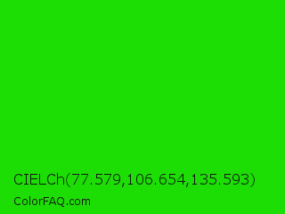 CIELCh 77.579,106.654,135.593 Color is a normal green color and the nearest color is Green #00ff00. Hex code #1cde05 and RGB value is rgb(28,222,5). In RGB color space, this color is composed of 11% red, 87% green, 2% blue, In CMYK color space, this color is composed of 87% cyan, 0% magenta, 98% yellow , 13% black , In HSL color space, this color has a hue angle of 114° , 96% saturation and 45% lightness.