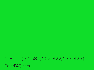 CIELCh 77.581,102.322,137.825 Color is a normal green color and the nearest color is Vivid Malachite #00cc33. Hex code #0fde29 and RGB value is rgb(15,222,41). In RGB color space, this color is composed of 6% red, 87% green, 16% blue, In CMYK color space, this color is composed of 93% cyan, 0% magenta, 82% yellow , 13% black , In HSL color space, this color has a hue angle of 128° , 87% saturation and 46% lightness.