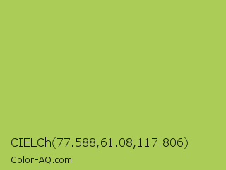 CIELCh 77.588,61.08,117.806 Color is a normal lime color and the nearest color is Middle Green Yellow #acbf60. Hex code #abcc56 and RGB value is rgb(171,204,86). In RGB color space, this color is composed of 67% red, 80% green, 34% blue, In CMYK color space, this color is composed of 16% cyan, 0% magenta, 58% yellow , 20% black , In HSL color space, this color has a hue angle of 77° , 54% saturation and 57% lightness.