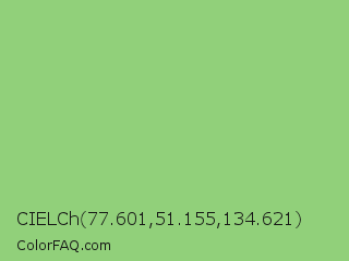 CIELCh 77.601,51.155,134.621 Color is a light green color and the nearest color is Pistachio #93c572. Hex code #91d07a and RGB value is rgb(145,208,122). In RGB color space, this color is composed of 57% red, 82% green, 48% blue, In CMYK color space, this color is composed of 30% cyan, 0% magenta, 41% yellow , 18% black , In HSL color space, this color has a hue angle of 104° , 48% saturation and 65% lightness.