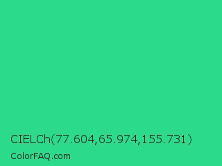 CIELCh 77.604,65.974,155.731 Color is a normal green color and the nearest color is Shamrock #33cc99. Hex code #2cda8b and RGB value is rgb(44,218,139). In RGB color space, this color is composed of 17% red, 85% green, 55% blue, In CMYK color space, this color is composed of 80% cyan, 0% magenta, 36% yellow , 15% black , In HSL color space, this color has a hue angle of 153° , 70% saturation and 51% lightness.