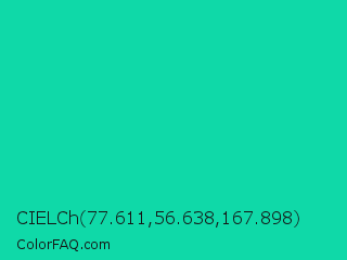 CIELCh 77.611,56.638,167.898 Color is a normal cyan color and the nearest color is Caribbean Green #00cc99. Hex code #0fd9a8 and RGB value is rgb(15,217,168). In RGB color space, this color is composed of 6% red, 85% green, 66% blue, In CMYK color space, this color is composed of 93% cyan, 0% magenta, 23% yellow , 15% black , In HSL color space, this color has a hue angle of 165° , 87% saturation and 45% lightness.