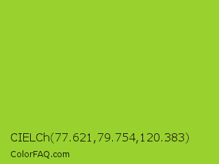 CIELCh 77.621,79.754,120.383 Color is a normal green color and the nearest color is Atlantis #97cd2d. Hex code #99d12e and RGB value is rgb(153,209,46). In RGB color space, this color is composed of 60% red, 82% green, 18% blue, In CMYK color space, this color is composed of 27% cyan, 0% magenta, 78% yellow , 18% black , In HSL color space, this color has a hue angle of 81° , 64% saturation and 50% lightness.