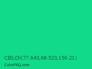 CIELCh 77.643,68.523,156.21 Color is a normal green color and the nearest color is Caribbean Green #00cc99. Hex code #10db8a and RGB value is rgb(16,219,138). In RGB color space, this color is composed of 6% red, 86% green, 54% blue, In CMYK color space, this color is composed of 93% cyan, 0% magenta, 37% yellow , 14% black , In HSL color space, this color has a hue angle of 156° , 86% saturation and 46% lightness.