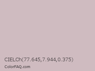 CIELCh 77.645,7.944,0.375 Color is a light red color and the nearest color is Cold Turkey #cebaba. Hex code #cfbbc0 and RGB value is rgb(207,187,192). In RGB color space, this color is composed of 81% red, 73% green, 75% blue, In CMYK color space, this color is composed of 0% cyan, 10% magenta, 7% yellow , 19% black , In HSL color space, this color has a hue angle of 345° , 17% saturation and 77% lightness.