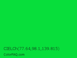 CIELCh 77.64,98.1,139.815 Color is a normal green color and the nearest color is Vivid Malachite #00cc33. Hex code #07de3b and RGB value is rgb(7,222,59). In RGB color space, this color is composed of 3% red, 87% green, 23% blue, In CMYK color space, this color is composed of 97% cyan, 0% magenta, 73% yellow , 13% black , In HSL color space, this color has a hue angle of 135° , 94% saturation and 45% lightness.