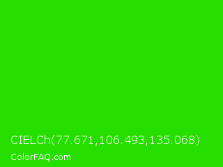 CIELCh 77.671,106.493,135.068 Color is a normal green color and the nearest color is Harlequin #3fff00. Hex code #26de00 and RGB value is rgb(38,222,0). In RGB color space, this color is composed of 15% red, 87% green, 0% blue, In CMYK color space, this color is composed of 83% cyan, 0% magenta, 100% yellow , 13% black , In HSL color space, this color has a hue angle of 110° , 100% saturation and 44% lightness.