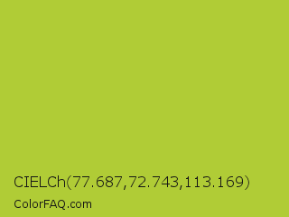 CIELCh 77.687,72.743,113.169 Color is a normal lime color and the nearest color is Android Green #a4c639. Hex code #b0cc36 and RGB value is rgb(176,204,54). In RGB color space, this color is composed of 69% red, 80% green, 21% blue, In CMYK color space, this color is composed of 14% cyan, 0% magenta, 74% yellow , 20% black , In HSL color space, this color has a hue angle of 71° , 60% saturation and 51% lightness.