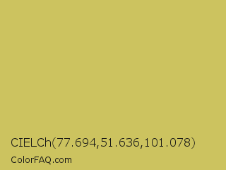 CIELCh 77.694,51.636,101.078 Color is a normal yellow color and the nearest color is Tacha #d6c562. Hex code #ccc35f and RGB value is rgb(204,195,95). In RGB color space, this color is composed of 80% red, 76% green, 37% blue, In CMYK color space, this color is composed of 0% cyan, 4% magenta, 53% yellow , 20% black , In HSL color space, this color has a hue angle of 55° , 52% saturation and 59% lightness.