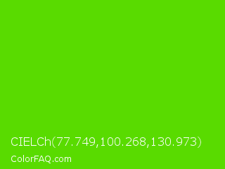 CIELCh 77.749,100.268,130.973 Color is a normal green color and the nearest color is Harlequin Green #46cb18. Hex code #59db00 and RGB value is rgb(89,219,0). In RGB color space, this color is composed of 35% red, 86% green, 0% blue, In CMYK color space, this color is composed of 59% cyan, 0% magenta, 100% yellow , 14% black , In HSL color space, this color has a hue angle of 96° , 100% saturation and 43% lightness.