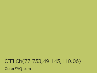CIELCh 77.753,49.145,110.06 Color is a normal yellow color and the nearest color is Wild Willow #b9c46a. Hex code #bec768 and RGB value is rgb(190,199,104). In RGB color space, this color is composed of 75% red, 78% green, 41% blue, In CMYK color space, this color is composed of 5% cyan, 0% magenta, 48% yellow , 22% black , In HSL color space, this color has a hue angle of 66° , 46% saturation and 59% lightness.