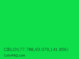 CIELCh 77.788,93.079,141.856 Color is a normal green color and the nearest color is Malachite #0bda51. Hex code #0fde4b and RGB value is rgb(15,222,75). In RGB color space, this color is composed of 6% red, 87% green, 29% blue, In CMYK color space, this color is composed of 93% cyan, 0% magenta, 66% yellow , 13% black , In HSL color space, this color has a hue angle of 137° , 87% saturation and 46% lightness.