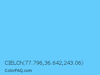 CIELCh 77.796,36.642,243.06 Color is a light blue color and the nearest color is Maya Blue #73c2fb. Hex code #63ccfc and RGB value is rgb(99,204,252). In RGB color space, this color is composed of 39% red, 80% green, 99% blue, In CMYK color space, this color is composed of 61% cyan, 19% magenta, 0% yellow , 1% black , In HSL color space, this color has a hue angle of 199° , 96% saturation and 69% lightness.