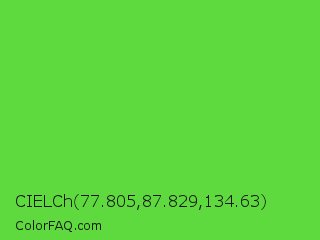 CIELCh 77.805,87.829,134.63 Color is a normal green color and the nearest color is Green RYB #66b032. Hex code #5eda3f and RGB value is rgb(94,218,63). In RGB color space, this color is composed of 37% red, 85% green, 25% blue, In CMYK color space, this color is composed of 57% cyan, 0% magenta, 71% yellow , 15% black , In HSL color space, this color has a hue angle of 108° , 68% saturation and 55% lightness.