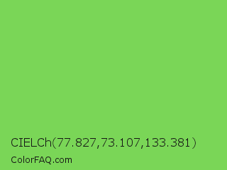 CIELCh 77.827,73.107,133.381 Color is a normal green color and the nearest color is Mantis #74c365. Hex code #7ad657 and RGB value is rgb(122,214,87). In RGB color space, this color is composed of 48% red, 84% green, 34% blue, In CMYK color space, this color is composed of 43% cyan, 0% magenta, 59% yellow , 16% black , In HSL color space, this color has a hue angle of 103° , 61% saturation and 59% lightness.