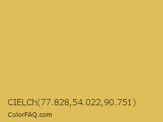 CIELCh 77.828,54.022,90.751 Color is a light yellow color and the nearest color is Equator #e1bc64. Hex code #ddbe59 and RGB value is rgb(221,190,89). In RGB color space, this color is composed of 87% red, 75% green, 35% blue, In CMYK color space, this color is composed of 0% cyan, 14% magenta, 60% yellow , 13% black , In HSL color space, this color has a hue angle of 46° , 66% saturation and 61% lightness.