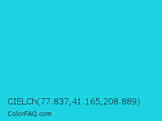 CIELCh 77.837,41.165,208.889 Color is a normal cyan color and the nearest color is Bright Turquoise #08e8de. Hex code #1cd4e4 and RGB value is rgb(28,212,228). In RGB color space, this color is composed of 11% red, 83% green, 89% blue, In CMYK color space, this color is composed of 88% cyan, 7% magenta, 0% yellow , 11% black , In HSL color space, this color has a hue angle of 185° , 79% saturation and 50% lightness.
