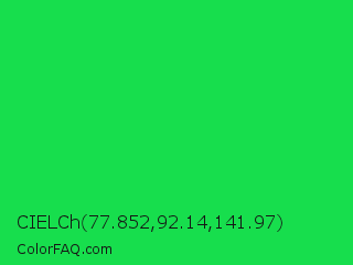 CIELCh 77.852,92.14,141.97 Color is a normal green color and the nearest color is Malachite #0bda51. Hex code #17de4d and RGB value is rgb(23,222,77). In RGB color space, this color is composed of 9% red, 87% green, 30% blue, In CMYK color space, this color is composed of 90% cyan, 0% magenta, 65% yellow , 13% black , In HSL color space, this color has a hue angle of 136° , 81% saturation and 48% lightness.