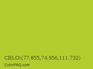 CIELCh 77.855,74.956,111.732 Color is a normal yellow color and the nearest color is Key Lime Pie #bfc921. Hex code #b3cc2e and RGB value is rgb(179,204,46). In RGB color space, this color is composed of 70% red, 80% green, 18% blue, In CMYK color space, this color is composed of 12% cyan, 0% magenta, 77% yellow , 20% black , In HSL color space, this color has a hue angle of 69° , 63% saturation and 49% lightness.