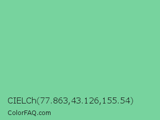 CIELCh 77.863,43.126,155.54 Color is a light green color and the nearest color is Medium Aquamarine #66ddaa. Hex code #77d39e and RGB value is rgb(119,211,158). In RGB color space, this color is composed of 47% red, 83% green, 62% blue, In CMYK color space, this color is composed of 44% cyan, 0% magenta, 25% yellow , 17% black , In HSL color space, this color has a hue angle of 145° , 51% saturation and 65% lightness.
