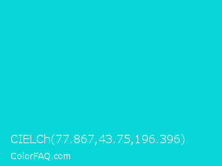 CIELCh 77.867,43.75,196.396 Color is a normal cyan color and the nearest color is Dark Turquoise #00ced1. Hex code #06d6d6 and RGB value is rgb(6,214,214). In RGB color space, this color is composed of 2% red, 84% green, 84% blue, In CMYK color space, this color is composed of 97% cyan, 0% magenta, 0% yellow , 16% black , In HSL color space, this color has a hue angle of 180° , 95% saturation and 43% lightness.