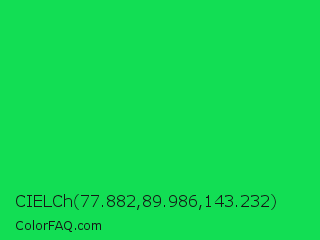 CIELCh 77.882,89.986,143.232 Color is a normal green color and the nearest color is Malachite #0bda51. Hex code #12de54 and RGB value is rgb(18,222,84). In RGB color space, this color is composed of 7% red, 87% green, 33% blue, In CMYK color space, this color is composed of 92% cyan, 0% magenta, 62% yellow , 13% black , In HSL color space, this color has a hue angle of 139° , 85% saturation and 47% lightness.