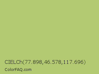 CIELCh 77.898,46.578,117.696 Color is a light lime color and the nearest color is Wild Willow #b9c46a. Hex code #b3ca72 and RGB value is rgb(179,202,114). In RGB color space, this color is composed of 70% red, 79% green, 45% blue, In CMYK color space, this color is composed of 11% cyan, 0% magenta, 44% yellow , 21% black , In HSL color space, this color has a hue angle of 76° , 45% saturation and 62% lightness.