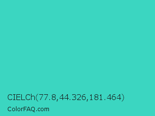 CIELCh 77.8,44.326,181.464 Color is a normal cyan color and the nearest color is Turquoise PWG #30d5c8. Hex code #3bd6c1 and RGB value is rgb(59,214,193). In RGB color space, this color is composed of 23% red, 84% green, 76% blue, In CMYK color space, this color is composed of 72% cyan, 0% magenta, 10% yellow , 16% black , In HSL color space, this color has a hue angle of 172° , 65% saturation and 54% lightness.
