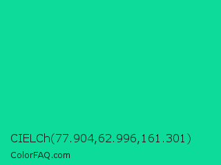 CIELCh 77.904,62.996,161.301 Color is a normal green color and the nearest color is Caribbean Green #00cc99. Hex code #0ddb99 and RGB value is rgb(13,219,153). In RGB color space, this color is composed of 5% red, 86% green, 60% blue, In CMYK color space, this color is composed of 94% cyan, 0% magenta, 30% yellow , 14% black , In HSL color space, this color has a hue angle of 161° , 89% saturation and 45% lightness.