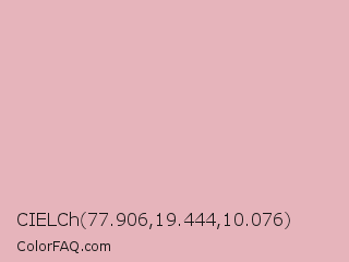 CIELCh 77.906,19.444,10.076 Color is a light red color and the nearest color is Shilo #e8b9b3. Hex code #e6b4bb and RGB value is rgb(230,180,187). In RGB color space, this color is composed of 90% red, 71% green, 73% blue, In CMYK color space, this color is composed of 0% cyan, 22% magenta, 19% yellow , 10% black , In HSL color space, this color has a hue angle of 352° , 50% saturation and 80% lightness.