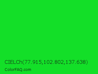 CIELCh 77.915,102.802,137.638 Color is a normal green color and the nearest color is Vivid Malachite #00cc33. Hex code #13df28 and RGB value is rgb(19,223,40). In RGB color space, this color is composed of 7% red, 87% green, 16% blue, In CMYK color space, this color is composed of 91% cyan, 0% magenta, 82% yellow , 13% black , In HSL color space, this color has a hue angle of 126° , 84% saturation and 47% lightness.