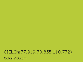 CIELCh 77.919,70.855,110.772 Color is a normal yellow color and the nearest color is Android Green #a4c639. Hex code #b7cb39 and RGB value is rgb(183,203,57). In RGB color space, this color is composed of 72% red, 80% green, 22% blue, In CMYK color space, this color is composed of 10% cyan, 0% magenta, 72% yellow , 20% black , In HSL color space, this color has a hue angle of 68° , 58% saturation and 51% lightness.