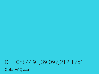 CIELCh 77.91,39.097,212.175 Color is a normal cyan color and the nearest color is Scooter #2ebfd4. Hex code #35d3e6 and RGB value is rgb(53,211,230). In RGB color space, this color is composed of 21% red, 83% green, 90% blue, In CMYK color space, this color is composed of 77% cyan, 8% magenta, 0% yellow , 10% black , In HSL color space, this color has a hue angle of 186° , 78% saturation and 55% lightness.