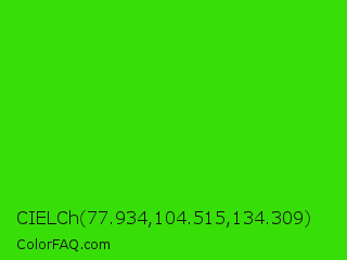 CIELCh 77.934,104.515,134.309 Color is a normal green color and the nearest color is Harlequin Green #46cb18. Hex code #38de08 and RGB value is rgb(56,222,8). In RGB color space, this color is composed of 22% red, 87% green, 3% blue, In CMYK color space, this color is composed of 75% cyan, 0% magenta, 96% yellow , 13% black , In HSL color space, this color has a hue angle of 107° , 93% saturation and 45% lightness.