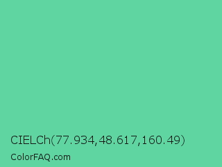 CIELCh 77.934,48.617,160.49 Color is a light green color and the nearest color is Medium Aquamarine #66ddaa. Hex code #5fd6a1 and RGB value is rgb(95,214,161). In RGB color space, this color is composed of 37% red, 84% green, 63% blue, In CMYK color space, this color is composed of 56% cyan, 0% magenta, 25% yellow , 16% black , In HSL color space, this color has a hue angle of 153° , 59% saturation and 61% lightness.