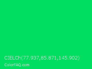 CIELCh 77.937,85.871,145.902 Color is a normal green color and the nearest color is Malachite #0bda51. Hex code #00de61 and RGB value is rgb(0,222,97). In RGB color space, this color is composed of 0% red, 87% green, 38% blue, In CMYK color space, this color is composed of 100% cyan, 0% magenta, 56% yellow , 13% black , In HSL color space, this color has a hue angle of 146° , 100% saturation and 44% lightness.