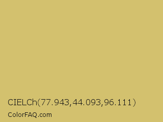 CIELCh 77.943,44.093,96.111 Color is a light yellow color and the nearest color is Apache #dfbe6f. Hex code #d3c16e and RGB value is rgb(211,193,110). In RGB color space, this color is composed of 83% red, 76% green, 43% blue, In CMYK color space, this color is composed of 0% cyan, 9% magenta, 48% yellow , 17% black , In HSL color space, this color has a hue angle of 49° , 53% saturation and 63% lightness.