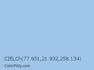 CIELCh 77.951,21.932,258.134 Color is a light blue color and the nearest color is Pale Cerulean #9bc4e2. Hex code #9fc5e8 and RGB value is rgb(159,197,232). In RGB color space, this color is composed of 62% red, 77% green, 91% blue, In CMYK color space, this color is composed of 31% cyan, 15% magenta, 0% yellow , 9% black , In HSL color space, this color has a hue angle of 209° , 61% saturation and 77% lightness.