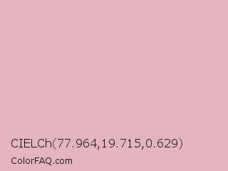 CIELCh 77.964,19.715,0.629 Color is a light rose color and the nearest color is Blossom #dcb4bc. Hex code #e5b4c1 and RGB value is rgb(229,180,193). In RGB color space, this color is composed of 90% red, 71% green, 76% blue, In CMYK color space, this color is composed of 0% cyan, 21% magenta, 16% yellow , 10% black , In HSL color space, this color has a hue angle of 344° , 49% saturation and 80% lightness.