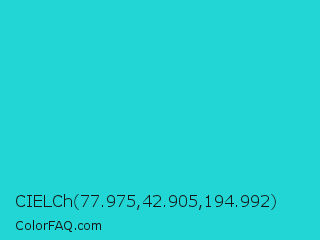 CIELCh 77.975,42.905,194.992 Color is a normal cyan color and the nearest color is Turquoise PWG #30d5c8. Hex code #21d6d4 and RGB value is rgb(33,214,212). In RGB color space, this color is composed of 13% red, 84% green, 83% blue, In CMYK color space, this color is composed of 85% cyan, 0% magenta, 1% yellow , 16% black , In HSL color space, this color has a hue angle of 179° , 73% saturation and 48% lightness.