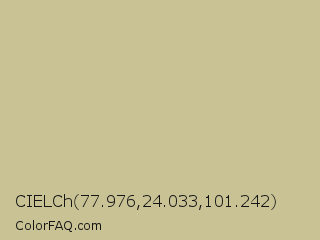 CIELCh 77.976,24.033,101.242 Color is a light yellow color and the nearest color is Yuma #cec291. Hex code #c9c295 and RGB value is rgb(201,194,149). In RGB color space, this color is composed of 79% red, 76% green, 58% blue, In CMYK color space, this color is composed of 0% cyan, 3% magenta, 26% yellow , 21% black , In HSL color space, this color has a hue angle of 52° , 33% saturation and 69% lightness.
