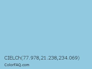 CIELCh 77.978,21.238,234.069 Color is a light blue color and the nearest color is Cornflower #93ccea. Hex code #91c9e0 and RGB value is rgb(145,201,224). In RGB color space, this color is composed of 57% red, 79% green, 88% blue, In CMYK color space, this color is composed of 35% cyan, 10% magenta, 0% yellow , 12% black , In HSL color space, this color has a hue angle of 197° , 56% saturation and 72% lightness.
