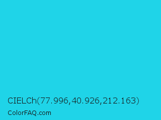 CIELCh 77.996,40.926,212.163 Color is a normal cyan color and the nearest color is Bright Turquoise #08e8de. Hex code #1fd4e8 and RGB value is rgb(31,212,232). In RGB color space, this color is composed of 12% red, 83% green, 91% blue, In CMYK color space, this color is composed of 87% cyan, 9% magenta, 0% yellow , 9% black , In HSL color space, this color has a hue angle of 186° , 81% saturation and 52% lightness.