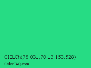 CIELCh 78.031,70.13,153.528 Color is a normal green color and the nearest color is Shamrock #33cc99. Hex code #26dc84 and RGB value is rgb(38,220,132). In RGB color space, this color is composed of 15% red, 86% green, 52% blue, In CMYK color space, this color is composed of 83% cyan, 0% magenta, 40% yellow , 14% black , In HSL color space, this color has a hue angle of 151° , 72% saturation and 51% lightness.