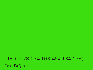 CIELCh 78.034,103.464,134.178 Color is a normal green color and the nearest color is Harlequin Green #46cb18. Hex code #3dde0f and RGB value is rgb(61,222,15). In RGB color space, this color is composed of 24% red, 87% green, 6% blue, In CMYK color space, this color is composed of 73% cyan, 0% magenta, 93% yellow , 13% black , In HSL color space, this color has a hue angle of 107° , 87% saturation and 46% lightness.