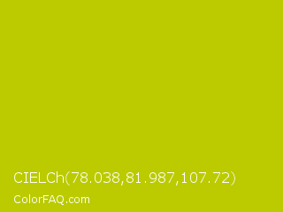 CIELCh 78.038,81.987,107.72 Color is a normal yellow color and the nearest color is Rio Grande #bbd009. Hex code #bbcb00 and RGB value is rgb(187,203,0). In RGB color space, this color is composed of 73% red, 80% green, 0% blue, In CMYK color space, this color is composed of 8% cyan, 0% magenta, 100% yellow , 20% black , In HSL color space, this color has a hue angle of 65° , 100% saturation and 40% lightness.