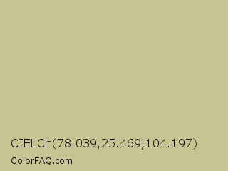 CIELCh 78.039,25.469,104.197 Color is a light yellow color and the nearest color is Yuma #cec291. Hex code #c7c393 and RGB value is rgb(199,195,147). In RGB color space, this color is composed of 78% red, 76% green, 58% blue, In CMYK color space, this color is composed of 0% cyan, 2% magenta, 26% yellow , 22% black , In HSL color space, this color has a hue angle of 55° , 32% saturation and 68% lightness.