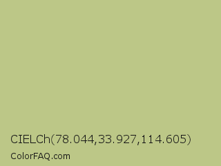 CIELCh 78.044,33.927,114.605 Color is a light yellow color and the nearest color is Sage #bcb88a. Hex code #bcc787 and RGB value is rgb(188,199,135). In RGB color space, this color is composed of 74% red, 78% green, 53% blue, In CMYK color space, this color is composed of 6% cyan, 0% magenta, 32% yellow , 22% black , In HSL color space, this color has a hue angle of 70° , 36% saturation and 65% lightness.