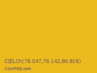 CIELCh 78.047,76.142,86.818 Color is a normal yellow color and the nearest color is Deep Lemon #f5c71a. Hex code #ebbb1d and RGB value is rgb(235,187,29). In RGB color space, this color is composed of 92% red, 73% green, 11% blue, In CMYK color space, this color is composed of 0% cyan, 20% magenta, 88% yellow , 8% black , In HSL color space, this color has a hue angle of 46° , 84% saturation and 52% lightness.